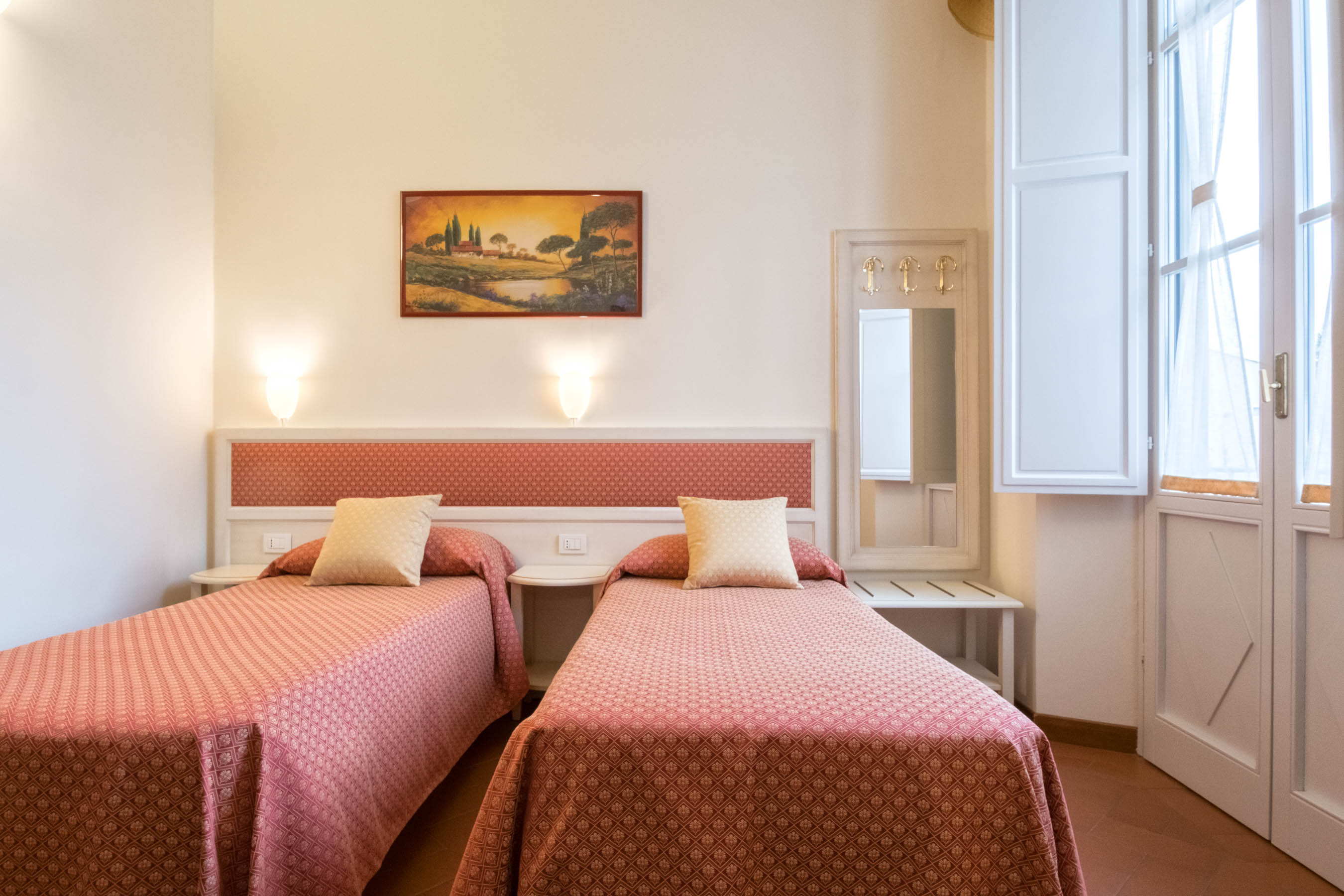 Si tratta di una camera familiare con bagno al centro comunicante delle due stanze, la camera 3 ha un letto matrimoniale con finestra vista giardino interno, mentre la camera 4 due letti singoli con balcone che si affaccia sul giardino